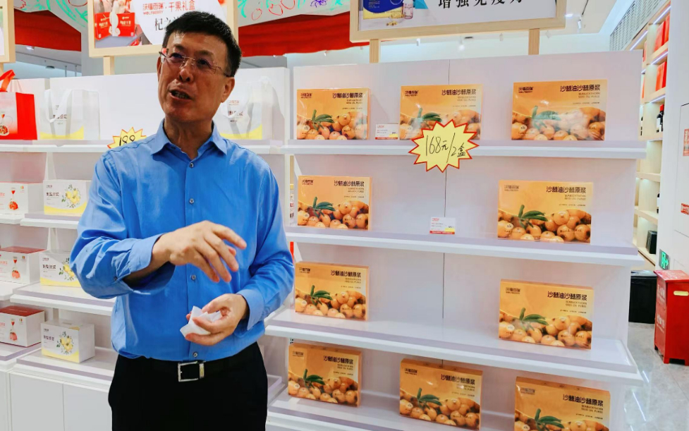 國家林業(yè)重點龍頭企業(yè)寧夏沃福百瑞公司產(chǎn)品間展示柜上擺放的沙棘油、沙棘原漿。新華網(wǎng)郭香玉攝