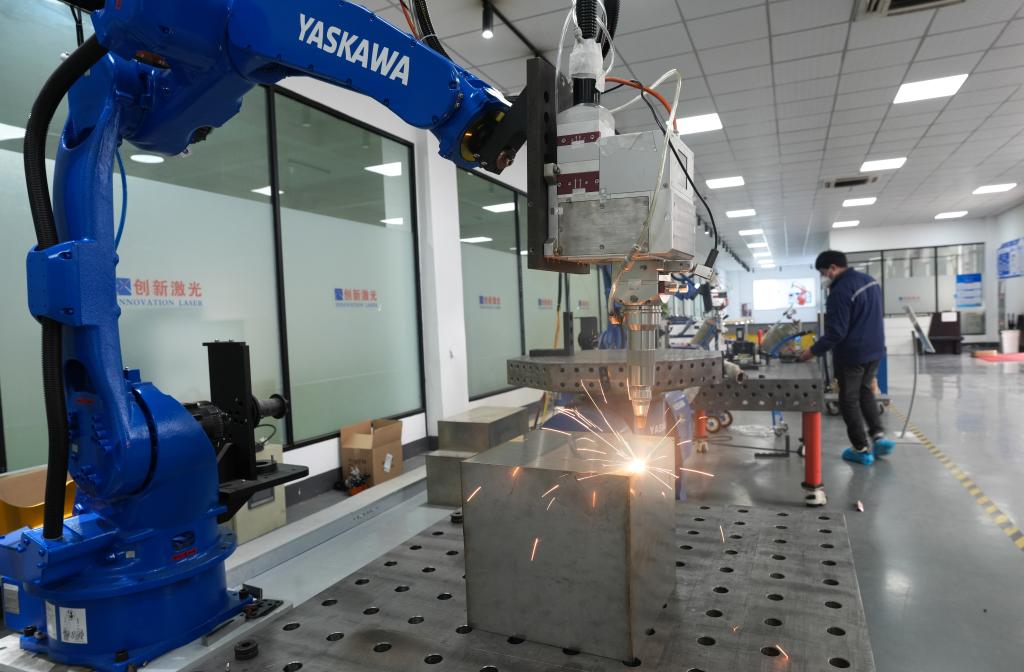 1月7日,紹興市上虞區(qū)浙江創(chuàng)新激光設(shè)備有限公司的機(jī)械臂對不銹鋼產(chǎn)品進(jìn)行無縫激光焊接。 新華社照片,紹興(浙江)(2025年1月7日)新華社記者 翁忻旸 攝