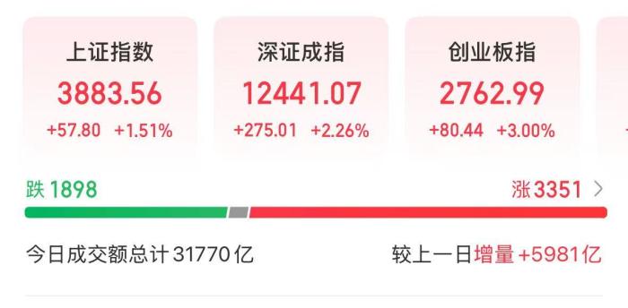 中新網(wǎng)北京8月25日電(記者 謝藝觀)25日,A股三大股指延續(xù)上漲態(tài)勢,滬指趨近3900點,創(chuàng)業(yè)板指創(chuàng)3年新高。 截至收盤,滬指漲1.51%報3883.56點,深成指漲2.26%報12441.07點,創(chuàng)業(yè)板指漲3%報2762.99點。滬深京三市全天成交額31770億元,較前一交易日大幅放量。