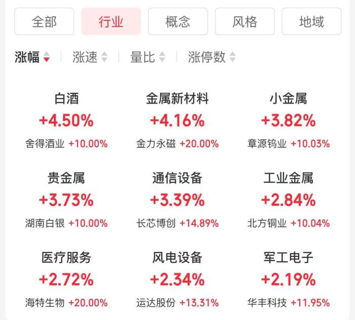 A股三大股指收盤表現(xiàn)。截圖自同花順。 盤面上,白酒、金屬新材料、通信設(shè)備等行業(yè)板塊漲幅居前。概念板塊方面,稀土永磁概念大漲,帶動金力永磁、中鋼天源、領(lǐng)益智造等相關(guān)個股漲停;另,F(xiàn)5G概念、金屬鉛等表現(xiàn)亮眼。