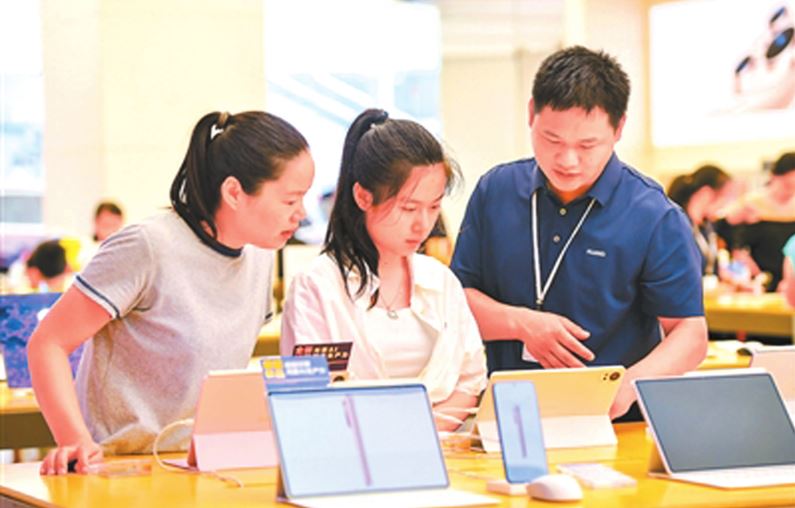 在江西省宜春市袁州區(qū)潤達國際購物中心的電子數(shù)碼產(chǎn)品專營店內,工作人員向消費者介紹平板電腦產(chǎn)品。
