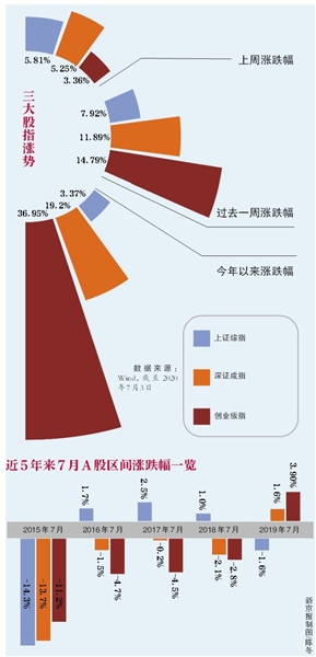 新京報記者統(tǒng)計了2010年7月-2019年7月間的數(shù)據(jù)發(fā)現(xiàn),事實(shí)上,指數(shù)在過去的10年中上漲與下跌的各約占半數(shù)。其中,滬指方面,近10年里,滬指6次在7月出現(xiàn)上漲,4次出現(xiàn)下跌。2010年7月為近10年的7月里上漲幅度最高的一年,漲幅為9.97%;2015年7月,滬指大幅下跌14.34%,是十年中7月跌幅最高的一年。
