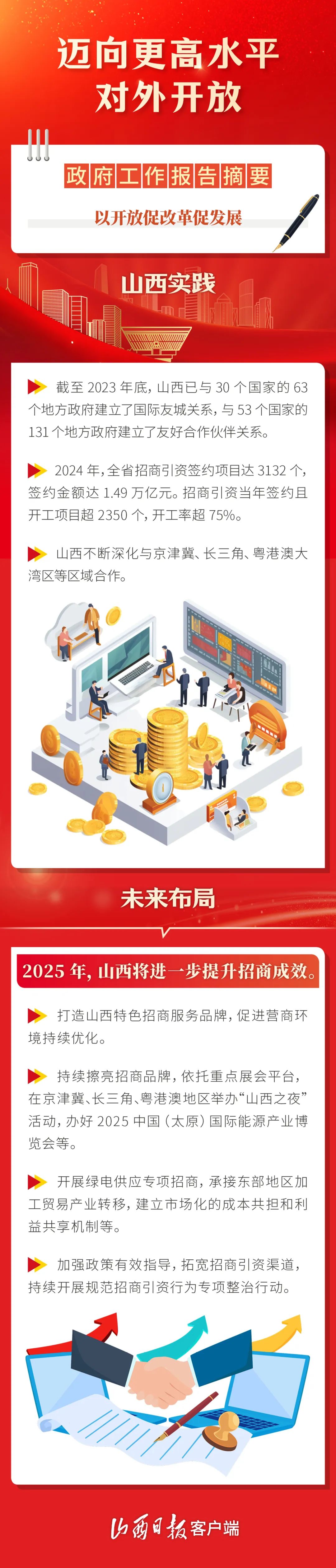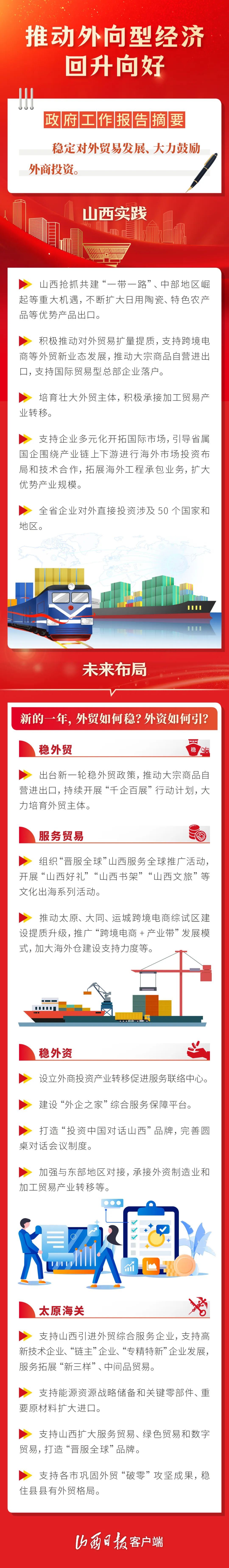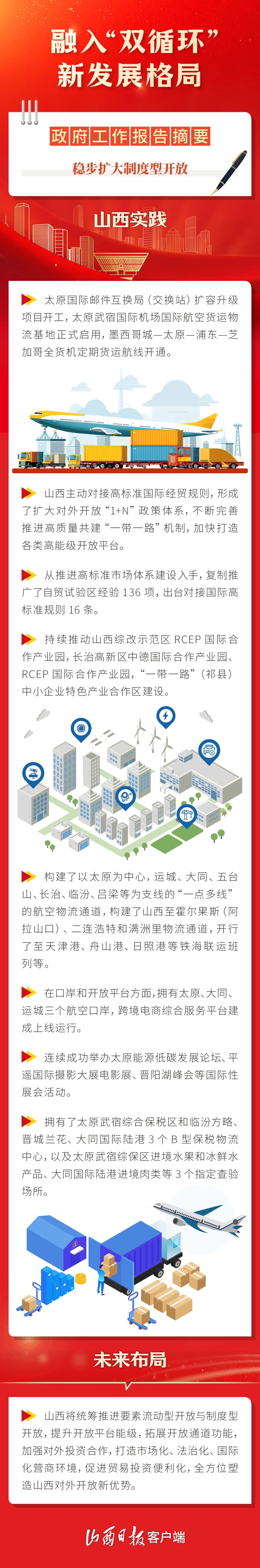 今年的政府工作報(bào)告提出,“擴(kuò)大高水平對(duì)外開放,積極穩(wěn)外貿(mào)穩(wěn)外資”。 站在新的起點(diǎn),山西明確提出“以高水平開放推動(dòng)高質(zhì)量發(fā)展”,將“打造內(nèi)陸地區(qū)對(duì)外開放新高地”作為核心任務(wù)之一。 一組圖解,看山西如何打造內(nèi)陸地區(qū)對(duì)外開放新高地、繪出開放奮進(jìn)新畫卷。