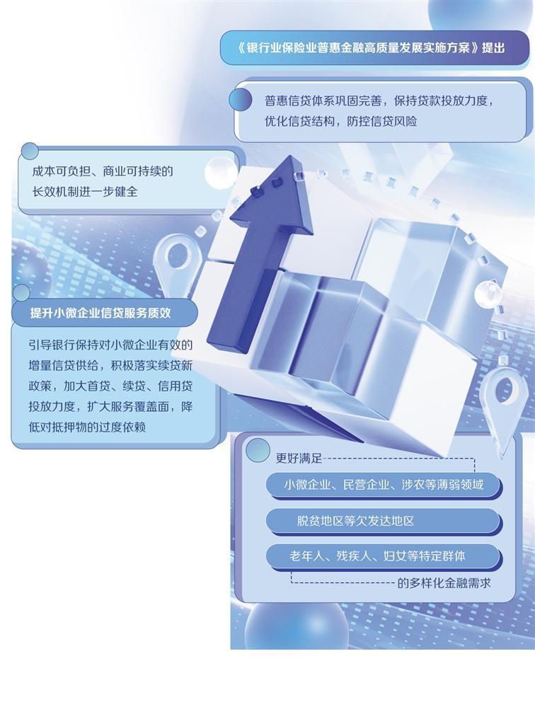 近年來,我國普惠金融發(fā)展取得長足進步,金融服務(wù)的普惠性不斷提升。近期印發(fā)的《銀行業(yè)保險業(yè)普惠金融高質(zhì)量發(fā)展實施方案》(以下簡稱《實施方案》)在主要目標(biāo)中提出,普惠信貸體系鞏固完善,保持貸款投放力度,優(yōu)化信貸結(jié)構(gòu),防控信貸風(fēng)險,成本可負擔(dān)、商業(yè)可持續(xù)的長效機制進一步健全,更好滿足小微企業(yè)、民營企業(yè)、涉農(nóng)等薄弱領(lǐng)域,脫貧地區(qū)等欠發(fā)達地區(qū)以及老年人、殘疾人、婦女等特定群體的多樣化金融需求。