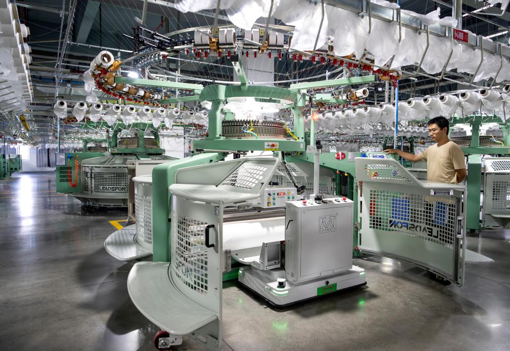 7月24日,一名工人在泉州聯(lián)興發(fā)針織織造有限公司的萊卡+5G智能數(shù)字化生產(chǎn)車間操控機(jī)器人工作。新華社記者 魏培全 攝??