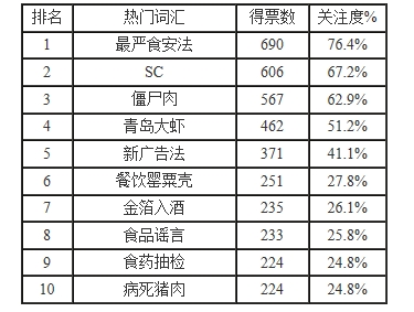 據(jù)悉,本次活動首先由食品伙伴網(wǎng)的“食品論壇”板塊網(wǎng)友針對2015年的熱門事件概括成一個關(guān)鍵詞,之后經(jīng)過整理篩選出20個候選詞匯,并于2016年1月21日-2月17日在食品論壇投票。期間共有 902位經(jīng)過審核認(rèn)證的注冊網(wǎng)友參與投票,最終選出十大熱門詞匯。