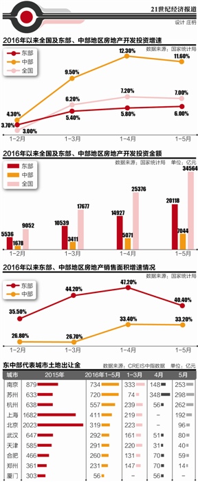 不過,整個4月,作為一線城市的北京和上海竟無一幅地塊出讓,而到了5月,北京、上海、蘇州、南京、杭州開始集中供地,僅這5個城市當(dāng)月的土地出讓金就高達1101億元。作為中部城市的合肥、武漢、鄭州等地卻放慢了供地節(jié)奏,這成為導(dǎo)致中部地區(qū)房地產(chǎn)開發(fā)投資增速在5月首次調(diào)頭向下的主因。