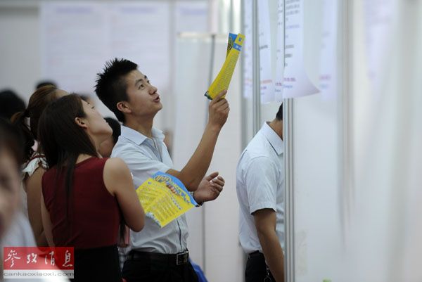 資料圖片:2014年6月15日,求職者在第四屆寧蒙陜甘(銀川)毗鄰城市區(qū)域合作大型人才智力交流大會(huì)現(xiàn)場(chǎng)觀看招聘信息。新華社記者李然攝。
