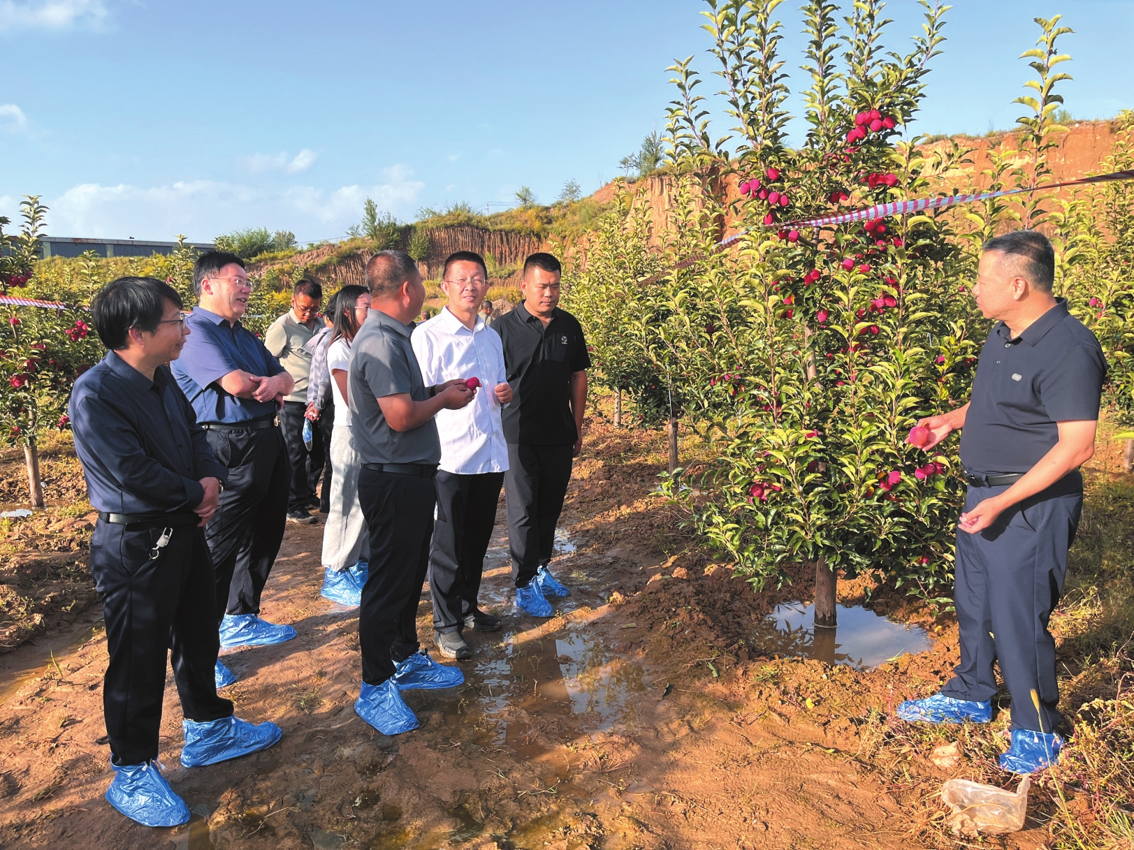觀摩期間,技術(shù)人員全面介紹了示范果園的建設(shè)背景、關(guān)鍵栽培技術(shù)及主要管理措施,重點講解了河曲紅海棠的品種特性、創(chuàng)新技術(shù)應(yīng)用成效等核心亮點。參會人員深入田間,實地察看果樹長勢與掛果情況,并與技術(shù)團隊現(xiàn)場交流,詳細了解配套栽培措施、季節(jié)性管理要點及該品種在新技術(shù)模式下的實際生長狀況,進一步加深了對對品種優(yōu)勢與技術(shù)推廣成效的認識。