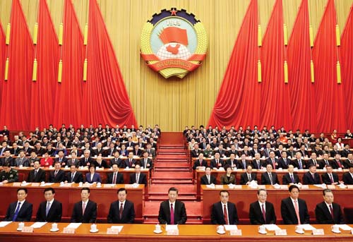 3 月15 日,中國人民政治協(xié)商會議第十三屆全國委員會第一次會議在北京閉幕。這是習(xí)近平、李克強、張德江、俞正聲、張高麗、栗戰(zhàn)書、王滬寧、趙樂際、韓正等在主席臺就座。新華社記者 丁 林 攝