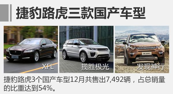 捷豹路虎去年能夠超越自我,實(shí)現(xiàn)新的銷量記錄,國(guó)產(chǎn)車型成為最重要因素。剛剛結(jié)束的2016年12月,捷豹路虎在華共售出13,859輛,與2015年同期(10,227輛)相比大漲36%。其中,捷豹路虎在華合資公司生產(chǎn)的3款國(guó)產(chǎn)車型捷豹XFL、路虎極光、發(fā)現(xiàn)神行,12月共售出7,492輛,占總銷量的比重達(dá)到54%。