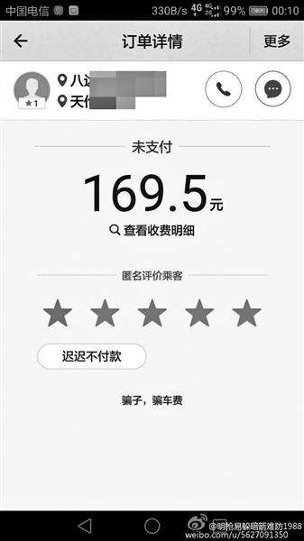在某網(wǎng)站論壇上,一名順風車司機爆料說,晚上下班后接了一單滴滴順風車,想著反正順路,上班路上接一單抵個油費也是好的。送到目的地后,自己出于習慣讓乘客先下車后付款,沒想到對方是用小號注冊的滴滴賬戶,晚飯后再打電話已經(jīng)是“空號”?!斑@顯然是惡意打霸王車啊?!?/p>