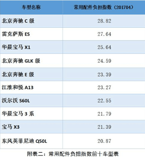 常用配件負(fù)擔(dān)指數(shù)方面,在汽車(chē)零整比系數(shù)基礎(chǔ)上,挖掘事故車(chē)維修數(shù)據(jù),選取配件損失率大于 1%的常用配件進(jìn)行研究,導(dǎo)入計(jì)算公式核算各車(chē)型的常用配件負(fù)擔(dān)指數(shù)。在樣本車(chē)型中最高的車(chē)型為北京奔馳 C級(jí),常用配件負(fù)擔(dān)指數(shù)為 28.82;最低的車(chē)型為哈弗 H6,常用配件負(fù)擔(dān)指數(shù)為 9.32。