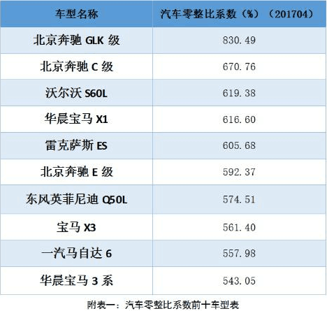 對(duì)于老百姓而言,在得知北京奔馳 GLK級(jí)配件的價(jià)格總和可以買(mǎi) 8輛整車(chē)時(shí),可能也僅僅是增添了對(duì)這部分車(chē)主的“羨慕”,然而,奔馳寶馬在我國(guó)說(shuō)到底本就不是平民車(chē)。那么,我們就來(lái)看看 2017年一季度賣(mài)得最好的幾個(gè)品牌車(chē)型的零整比系數(shù)如何,下面的數(shù)據(jù)對(duì)你買(mǎi)車(chē)真的有幫助呦!