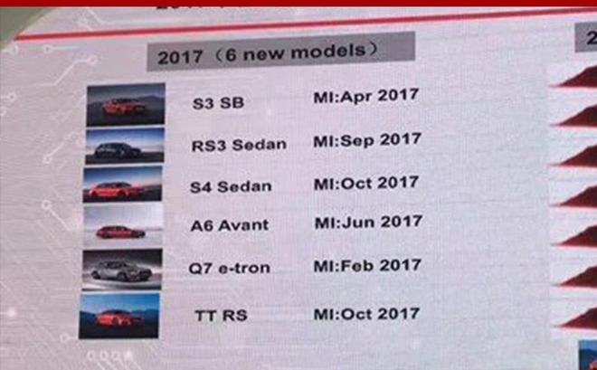 從曝光的產(chǎn)品規(guī)劃來(lái)看,2017年奧迪有6款新車上市。到目前為止,奧迪Q7 e-tron和A6 Avant已經(jīng)按照規(guī)劃正式上市。原本計(jì)劃在4月上市的S3 Sportback有望三季度正式投入市場(chǎng),奧迪RS 3 Sedan在9月上市,而奧迪S4 Sedan與TT RS將于今年10月上市。