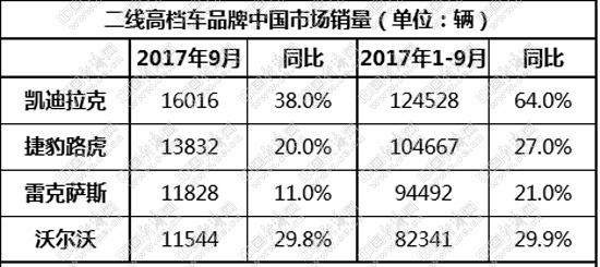 相比上月,9月的二線高檔車市似乎漲勢更甚。凱迪拉克、捷豹路虎、雷克薩斯、沃爾沃四家品牌9月銷量均超萬輛,9月及前9月同比漲幅均超2位數(shù)。整體漲勢之下,二線高檔車市的排名趨勢愈發(fā)穩(wěn)定、清晰。然而,伴隨“神鋼”造假事件的不斷發(fā)酵,也為這一市場增添一大變數(shù)。