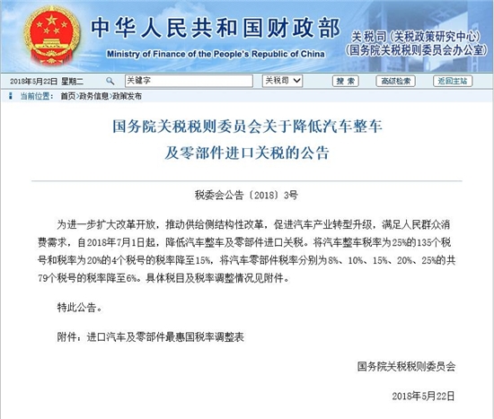 5月22日,國家財(cái)政部發(fā)布公告,自2018年7月1日起,降低汽車整車及零部件進(jìn)口關(guān)稅。將汽車整車稅率為25%的135個稅號和稅率為20%的4個稅號的稅率降至15%,將汽車零部件稅率分別為8%、10%、15%、20%、25%的共79個稅號的稅率降至6%。