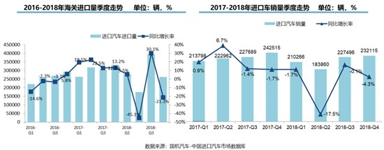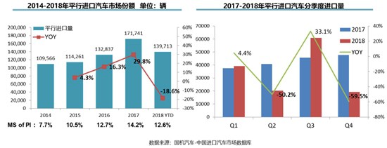 聚焦平行進口車市場,2018年,平行進口汽車銷量出現(xiàn)了5年來的首次下滑,且市場波動明顯。2018年,平行進口車銷量占進口車總銷量的12.6%,達13.97萬輛,同比下滑18.6%,下滑幅度遠超進口車市場整體表現(xiàn)。而中美貿(mào)易摩擦、國內(nèi)對車輛環(huán)保要求更為嚴格等因素,也導致平行進口車的銷量走低。各個季度的表現(xiàn)則更能體現(xiàn)該市場的巨幅波動,其中,平行進口車一季度銷量同比增長4.4%,表現(xiàn)穩(wěn)定;二季度卻出現(xiàn)50.2%的大幅下滑;三季度報復性回漲33.1%,四季度依舊疲軟;最終,平行進口車在2018年全年的銷量呈現(xiàn)大幅下滑的局面。