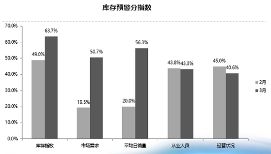 從庫存預(yù)警分指數(shù)來看,庫存指數(shù)、市場需求指數(shù)、平均日銷量指數(shù)環(huán)比上升;從業(yè)人員指數(shù)、經(jīng)營狀況指數(shù)環(huán)比下降。郎學(xué)紅表示,市場需求和日均銷量有明顯提升,然而由于經(jīng)銷商主動增加庫存和增值稅調(diào)整帶來的消費者觀望,使得經(jīng)營狀況并未出現(xiàn)好轉(zhuǎn)。