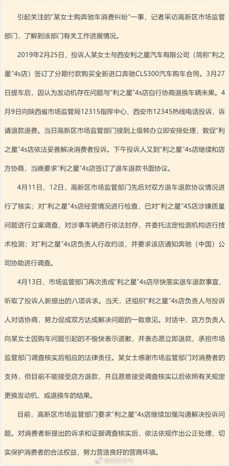 據(jù)西安市互聯(lián)網(wǎng)信息辦公室官方微博消息稱,4月13日,高新區(qū)市場監(jiān)管部門曾組織利之星4S店負(fù)責(zé)人與投訴人進(jìn)行對話協(xié)商。對話中,店方負(fù)責(zé)人向奔馳女車主因購車問題引起的不愉快表示道歉,并表態(tài)愿立即退款、承擔(dān)市場監(jiān)管部門調(diào)查核實后相應(yīng)的法律責(zé)任。該奔馳女車主感謝市場監(jiān)管部門對消費者的支持,但目前不能接受店方退款,也愿意接受調(diào)查核實以后依照有關(guān)規(guī)定更換發(fā)動機(jī)、或退換車的結(jié)果。