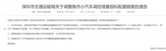 《深圳市交通運(yùn)輸局關(guān)于調(diào)整我市小汽車調(diào)控增量指標(biāo)配置額度的通告》內(nèi)容如下:2019年6月起,在原定每年普通小汽車增量指標(biāo)配置額度為8萬個(gè)的調(diào)控目標(biāo)基礎(chǔ)上,2019年至2020年每年增加投放普通小汽車增量指標(biāo)4萬個(gè)(個(gè)人指標(biāo)占88%,企業(yè)指標(biāo)占12%),其中,1萬個(gè)采取搖號(hào)方式配置,3萬個(gè)采取競(jìng)價(jià)方式配置。2019年增加的4萬個(gè)指標(biāo)按月平均分配到2019年6-12月,2020年增加的4萬個(gè)指標(biāo)按月平均分配到全年12個(gè)月;使用新增的小汽車指標(biāo)在我市辦理小汽車注冊(cè)登記時(shí),小汽車須符合國VI標(biāo)準(zhǔn);新增的4萬個(gè)小汽車指標(biāo)依照《深圳市小汽車增量調(diào)控管理實(shí)施細(xì)則》管理。