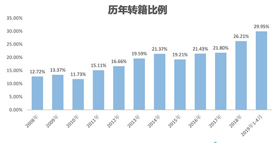 4月,使用年限在3-6年的二手車交易量最多,占比為43.65%,環(huán)比回落0.4個百分點;其次是3年內,占比為23.8%,環(huán)比回落0.23個百分點,1-4月,跨城市交易額比例達到29.95%。流通協(xié)會副秘書長羅磊表示,隨著全國各區(qū)域二手車流通的壁壘逐步消除,二手車全國自由流通越來越快捷,這一利好因素促使國內二手車交易轉籍比例在過去10年里呈逐年上升趨勢。