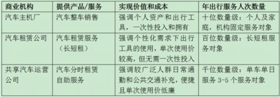 汽車主機廠、租車公司、共享汽車運營公司關(guān)于出行的價值特點如下圖所示。