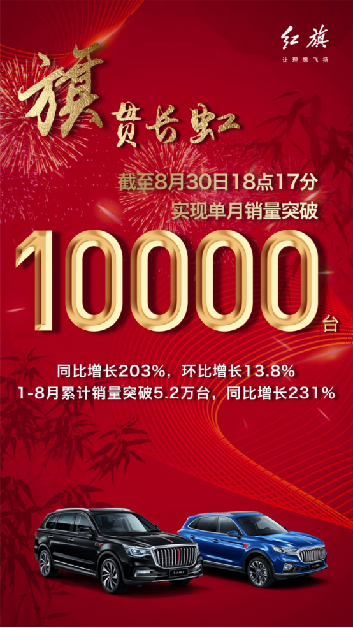 2019年8月30日18點(diǎn)17分,據(jù)紅旗官宣,紅旗品牌單月銷量已突破10000輛,同比增長(zhǎng)203%,環(huán)比增長(zhǎng)13.8%,至此,1-8月累計(jì)實(shí)現(xiàn)銷量5.2萬(wàn)輛,同比增長(zhǎng)231%。單月突破10000輛的成績(jī),使紅旗首次躋身月銷萬(wàn)輛俱樂部,這一極具里程碑意義的銷量數(shù)字,讓紅旗進(jìn)入了主流豪華品牌陣營(yíng),書寫了紅旗誕生61年來新的紀(jì)錄,也驗(yàn)證了紅旗正以氣貫長(zhǎng)虹的勇猛之勢(shì),實(shí)現(xiàn)著全方位的“跨越”。