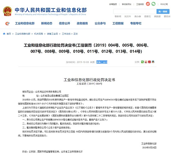 經(jīng)濟(jì)日?qǐng)?bào)-中國(guó)經(jīng)濟(jì)網(wǎng)10月8日訊(記者 郭躍)今日,工業(yè)和信息化部(以下簡(jiǎn)稱“工信部”)發(fā)布公告,對(duì)11家不符合《道路機(jī)動(dòng)車輛生產(chǎn)企業(yè)及產(chǎn)品公告》(以下簡(jiǎn)稱《公告》)管理中關(guān)于生產(chǎn)一致性管理相關(guān)規(guī)定的公司進(jìn)行行政處罰。處罰內(nèi)容包括停止以上11家公司生產(chǎn)和銷售違規(guī)產(chǎn)品,并撤銷產(chǎn)品《公告》;責(zé)成以上公司進(jìn)行為期6個(gè)月的整改;同時(shí),整改期間暫停公司《公告》新產(chǎn)品申報(bào)資格。