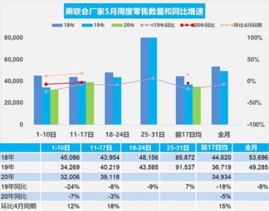 乘聯(lián)會(huì)20日發(fā)布的數(shù)據(jù)顯示,5月第二周(11-17日)的乘用車市場(chǎng)零售表現(xiàn)改善,環(huán)比增長18%,相對(duì)前期5月第二周的環(huán)比增長放緩的情況,今年的5月零售走勢(shì)回暖的態(tài)勢(shì)明顯。