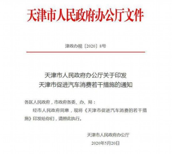 5月20日,天津市人民政府辦公廳印發(fā)《天津市促進(jìn)汽車消費(fèi)的若干措施》(以下簡稱《措施》),2020年內(nèi)新增小客車個人增量指標(biāo)配置額度35000個。