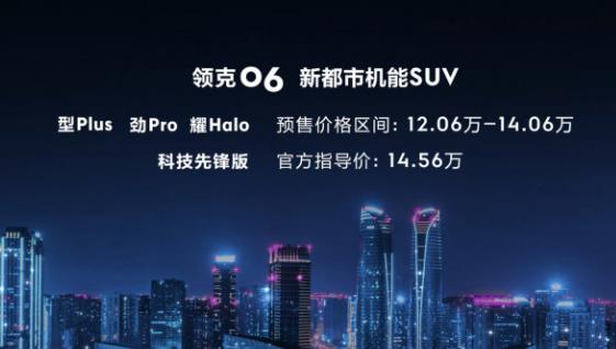2020年7月24日,領(lǐng)克06于成都車展公布了型Plus、勁Pro、耀Halo三款車型的預(yù)售價(jià)格,區(qū)間為12.06-14.06萬,并于7月24日下午16:06于領(lǐng)克商城開啟線上預(yù)訂。同時(shí),首發(fā)600臺(tái)科技先鋒版,價(jià)格為14.56萬,將于8月6日16:06在領(lǐng)克商城開啟搶訂。