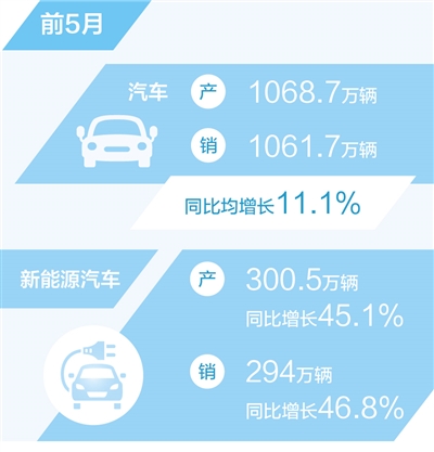乘用車、商用車產(chǎn)銷同比均較快增長。1—5月,乘用車?yán)塾?jì)完成銷量900.1萬輛,同比增長10.7%。商用車產(chǎn)銷分別完成162.5萬輛和161.6萬輛,同比分別增長14.2%和13.7%。其中,中國品牌乘用車市場份額持續(xù)增長,前5月累計(jì)銷售478.1萬輛,同比增長22.7%,市場份額53.1%,上升5.2個百分點(diǎn)。