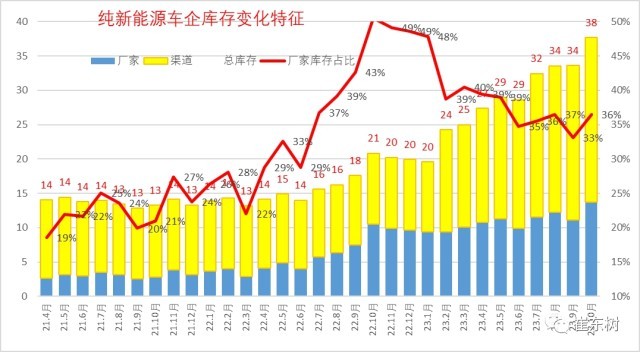 從僅生產(chǎn)新能源車的企業(yè)的庫(kù)存變化特征分析看,2023年年初庫(kù)存20萬(wàn),年初的庫(kù)存保持較好,總體新能源庫(kù)存在2月后開(kāi)始持續(xù)地上升,目前上升到10月末的38萬(wàn)臺(tái)水平。近期主要增長(zhǎng)的是經(jīng)銷商庫(kù)存,這也是經(jīng)銷模式為主流進(jìn)行新能源銷售的結(jié)果。