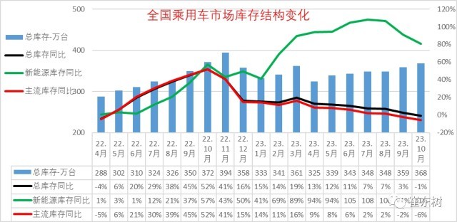 2023年10月的全國(guó)主流燃油乘用車行業(yè)庫(kù)存同比下降6%,因此判斷目前總體主流燃油乘用車行業(yè)處于去庫(kù)存周期。由于2022年10月是車購(gòu)稅優(yōu)惠政策的結(jié)束前期,因此廠家急迫大量生產(chǎn)燃油車,導(dǎo)致庫(kù)存暴增,而市場(chǎng)被封了,因此高庫(kù)存帶來(lái)較長(zhǎng)時(shí)間的痛苦去庫(kù)存,并帶來(lái)2023年3月的降價(jià)潮。近幾個(gè)月的燃油車市場(chǎng)總體處于萎縮的趨勢(shì),因此被動(dòng)去庫(kù)存的慘烈程度是很嚴(yán)重的,無(wú)論廠家還是經(jīng)銷商的日子都不好過(guò)。