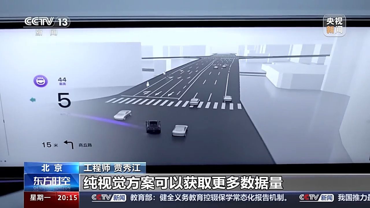 總臺央視記者 張叢婧:這里能夠看出每輛車的大小還有位置以及它們的行駛方向,這個綠色的是綠化帶,藍色的是隔離帶。它能夠識別的外部世界是非常具體化的。