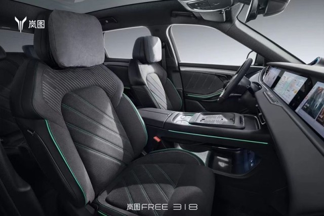 嵐圖FREE 318的內飾主要采用了全新的黑+綠配色,大量觸感出色的軟性材質,滿足視覺和觸覺雙重質感,新車不僅搭載了能夠滿足當下的智能化體驗,像前排座椅頭枕等也進一步提升了視覺體驗。