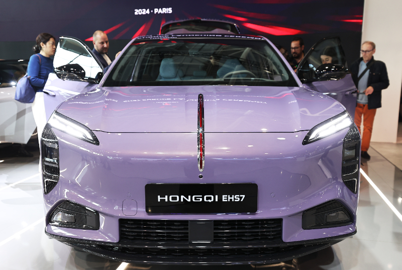 10月14日,人們?cè)诜▏?guó)巴黎凡爾賽門展覽中心舉行的2024巴黎車展媒體開(kāi)放日上參觀紅旗展臺(tái)。新華社記者 高靜 攝