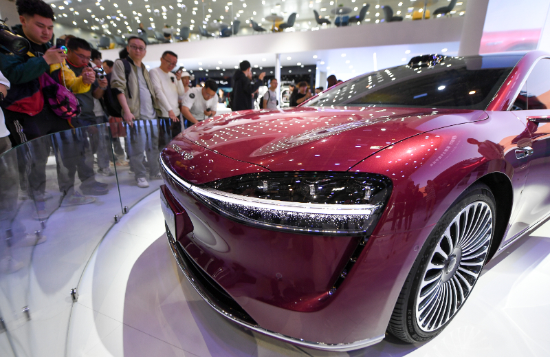 (資料圖)2024年4月25日,在北京中國國際展覽中心順義館舉行的2024北京車展上,參觀者觀看車展上發(fā)布的新款車型享界S9。新華社記者 鞠煥宗 攝