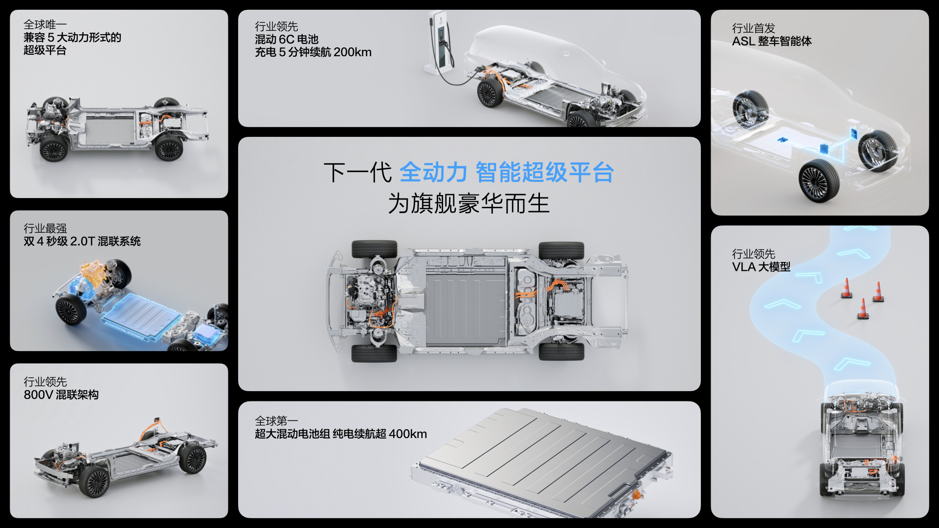 該平臺(tái)具備七大領(lǐng)先優(yōu)勢,分別是,兼容5大動(dòng)力形式的超級(jí)平臺(tái);雙4s(秒)級(jí)2.0T超級(jí)混聯(lián)系統(tǒng);800V混聯(lián)架構(gòu);超大混動(dòng)電池組,純電續(xù)航超400km;混動(dòng)6C電池,充電5分鐘續(xù)航200km;行業(yè)首發(fā)的整車智能體以及行業(yè)領(lǐng)先的VLA大模型、