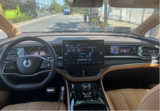 進入車內(nèi),騰勢D9以“雙色豪華”為主題,提供云峰棕、曠達米等多元配色方案,搭配山海百納真木飾板與NAPPA真皮座椅,營造出媲美百萬級豪車的座艙氛圍。中控臺采用15.6英寸懸浮式大屏與10.25英寸全液晶儀表的組合,搭載騰勢Link超智能交互系統(tǒng),支持全場景語音控制、多屏共享及10種情景模式切換,操作流暢度與響應(yīng)速度均達到行業(yè)頂尖水平。