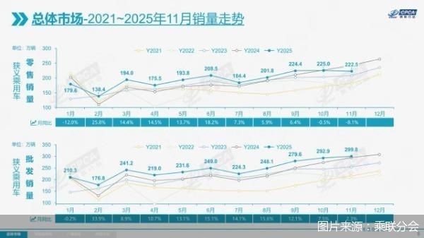 據(jù)統(tǒng)計(jì),今年11月全國乘用車市場零售222.5萬輛,同比下降8.1%,環(huán)比下降1.1%?!斑B續(xù)幾年的11月同比高增長,后面可能會(huì)有一個(gè)修正過程。”在崔東樹看來,車市呈現(xiàn)四季度高基數(shù)的減速特征,基本符合年初判斷的“前低中高后平”的走勢。