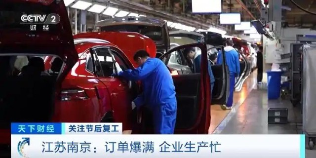 在南京市江北新區(qū)的一家大型汽車生產企業(yè),其中一個車間面積4萬平方米,產線從腳下延伸到了頭頂,工作人員正在緊張忙碌著,一輛輛嶄新的汽車高效地走向流水線。這里每天可以生產汽車1000輛左右。一些剛剛上市的新款新能源汽車產品,銷售非?;鸨?,訂單已經排到了今年下半年。正月初五這里已經全員在崗趕訂單。這個車間,每天兩個班組,1200多名工人日夜在崗,這個數字是去年春節(jié)同期的2.5倍。