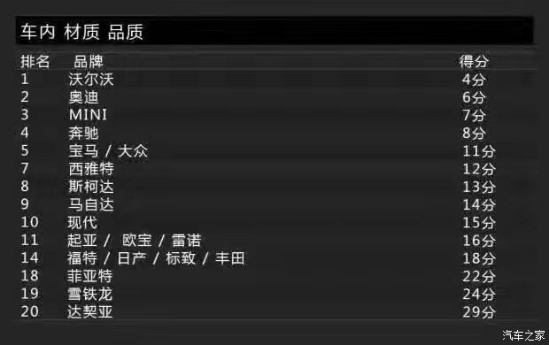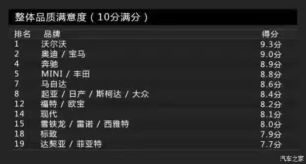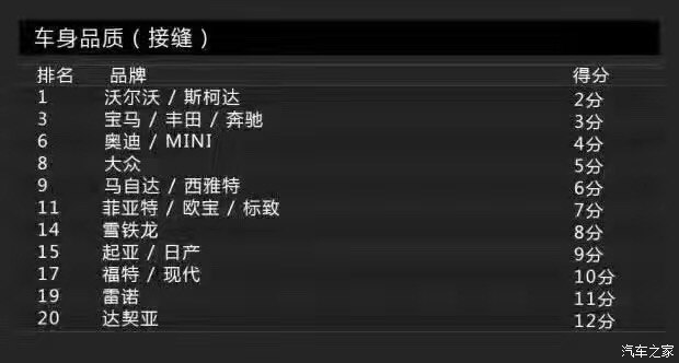 Bild調(diào)查的車身品質(zhì)(接縫)主要包括車身品質(zhì)、開關(guān)門的手感、鋼板接縫及經(jīng)常與身體接觸的地方。沒錯(cuò),這一單項(xiàng)表現(xiàn)最佳的是沃爾沃,得分為2分。這里小編要敲黑板提醒大家注意了:在車身品質(zhì)(接縫)滿意度上,得分最低表現(xiàn)最好。當(dāng)然,斯柯達(dá)也得到了2分,寶馬、奔馳則同為3分。而得分最高的就是前面提到的達(dá)契亞,它的得分是12分,換句話說就是達(dá)契亞是車身品質(zhì)滿意度最低的品牌。有意思的是與達(dá)契亞一起墊底是法系品牌雷諾,它的得分是11分。