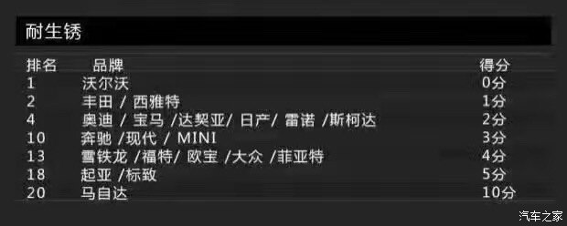 接下來這個(gè)項(xiàng)目的得分情況讓小編的心碎了一地,那就是耐生銹品質(zhì)。沃爾沃一如既往的穩(wěn)定,憑借0分的表現(xiàn)力挫群雄,險(xiǎn)勝豐田及西雅特這兩個(gè)品牌。值得關(guān)注的是,這次的倒數(shù)第一名竟換成了馬自達(dá),日系得了10分實(shí)屬少見。本來小編就打算入手一臺(tái)阿特茲,看到這個(gè)表現(xiàn),立馬變得很猶豫了有木有!生銹,生銹,居然生銹?