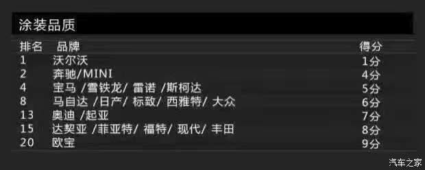 再來看看涂裝品質(zhì)方面,涂裝主要包括車漆亮度與耐腐蝕性。還是老規(guī)矩,得分最低就代表消費(fèi)者滿意度最高(下同)。沃爾沃的得分為1分,依然占據(jù)榜首的位置,或許排名第二的奔馳為4分,但跟沃爾沃差距有點(diǎn)大。得分最高的則是歐寶,為9分。另外,達(dá)契亞也有8分。