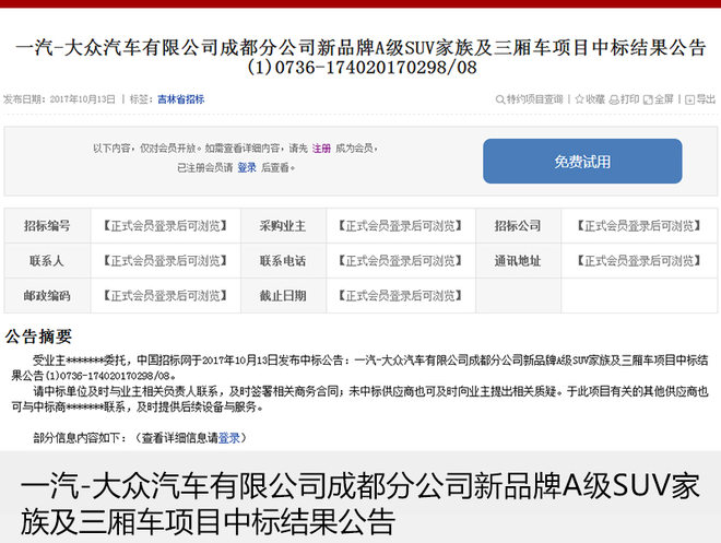日前,中國(guó)招標(biāo)網(wǎng)正式公布了《一汽-大眾汽車(chē)有限公司成都分公司新品牌A級(jí)SUV家族及三廂車(chē)項(xiàng)目中標(biāo)結(jié)果公告》從公告上來(lái)看,一汽-大眾汽車(chē)有限公司正在成都工廠準(zhǔn)備新品牌A級(jí)SUV兩款車(chē)型以及另外一款三廂車(chē)項(xiàng)目。該項(xiàng)目主要用于投產(chǎn)一汽-大眾全新經(jīng)濟(jì)用車(chē)品牌,以滿(mǎn)足消費(fèi)者對(duì)廉價(jià)車(chē)的購(gòu)買(mǎi)需求。