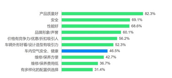 消費者前三大購車考慮因素是質量(82.3%)、安全(69.1%)和性能(68.6%),但疫情使車內空氣安全和健康上升成為購車時的又一考量重點(46.5%)。