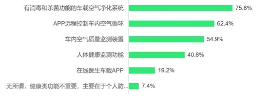被調查的有車一族也希望在車內增加空氣凈化和空氣質量監(jiān)測裝置。除此以外,人體健康監(jiān)測功能和在線醫(yī)生等與健康相關的功能和配置也愈發(fā)受到車主重視。汽車廠商應用具備車內空氣健康、安全的汽車新品,滿足消費者的需求。