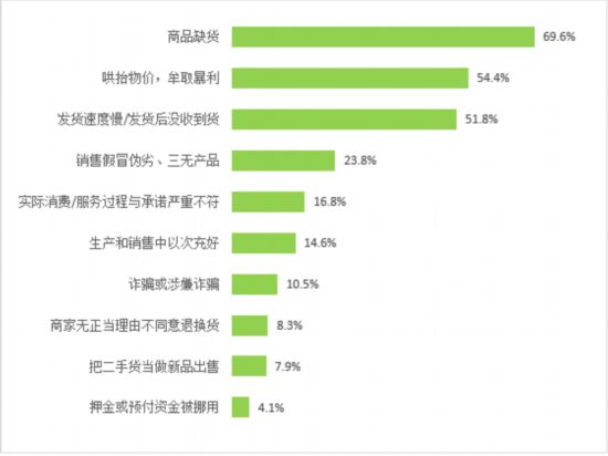 疫情期間,69.6%的受訪者主要遇到“商品缺貨”的消費(fèi)問題;54.4%的受訪者遇到“哄抬物價(jià),牟取暴利”,51.8%的受訪者遇到“發(fā)貨速度慢/發(fā)貨后沒收到貨”。